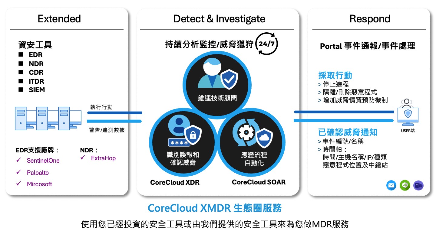 中芯數據Extended Managed Detection and Response (XMDR) 24/7/365 全天候服務 主動搜尋、檢測、確定優先級、調查和響應攻擊。