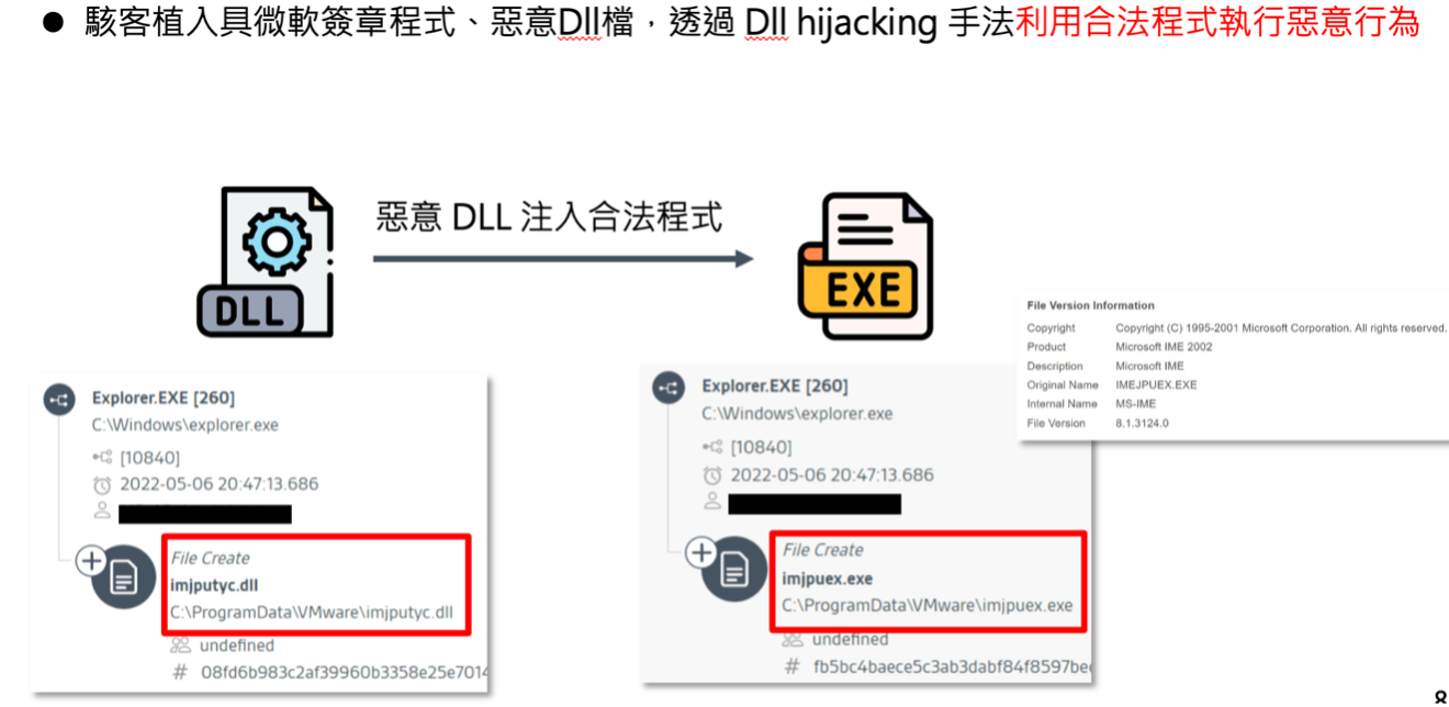 在防禦層面上,儘管單位內部已部署防毒軟體、其他閘道端資安設備,但仍難以偵測此種攻擊。原因在於,通常駭客皆使用未知惡意程式,單純僅靠情資、特徵值難以直接進行偵測。且在其中幾項案例曾看到,駭客植入具微軟簽章的程式,該程式為正常軟體,但駭客同時挾帶惡意DLL檔植入,並透過DLL Hijacking手法,使正常合法程式載入惡意DLL檔,以造成利用合法程式執行惡意行為之現象。在此狀況下,通常一般資安軟體可能會將許多正常合法程式的簽章加入白名單,更導致無法偵測此類惡意行為。
