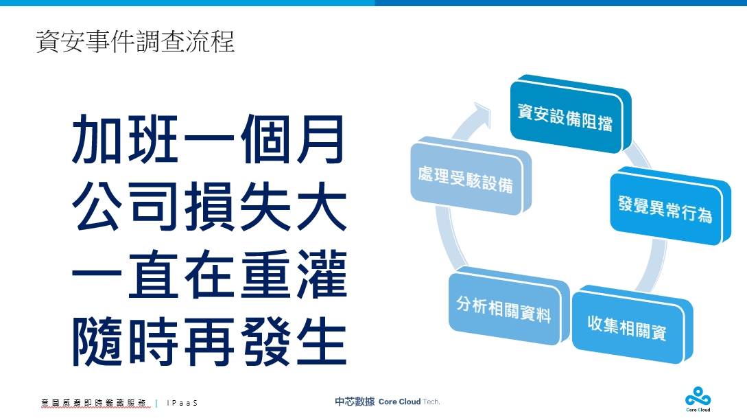 他說,過去合作過一些廠商,他們的EDR服務僅提供告警訊息,後續判讀、解決需他們自行處理,「但我們有時連分析,判斷都有問題,如何知道怎麼補漏洞?」因此中芯數據提供的即時處理服務對交通部的資安防護助益非常大,能夠提供更加全面的保障。「他們的專業團隊能夠快速反應並解決問題,確保資訊安全得到妥善維護。這樣的合作為交通部在數位時代中的運作提供了可靠的支援,讓我們能夠更加安心地並快速處理問題」。