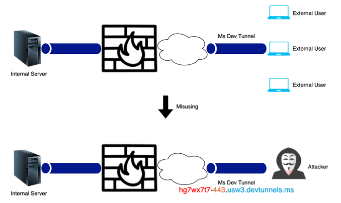 開發通道(Dev Tunnels)原先是微軟(2023)提供用來使本機開發環境向雲端服務連線,便於與遠端同事共事所提供之服務。建立該服務後,會取得一個專用的開發通道識別碼+微軟的公用URL,提供外部使用者可存取內網機器。此功能與上述提及的ngrok產品相同,駭客可濫用此服務作為內網穿透的工具。