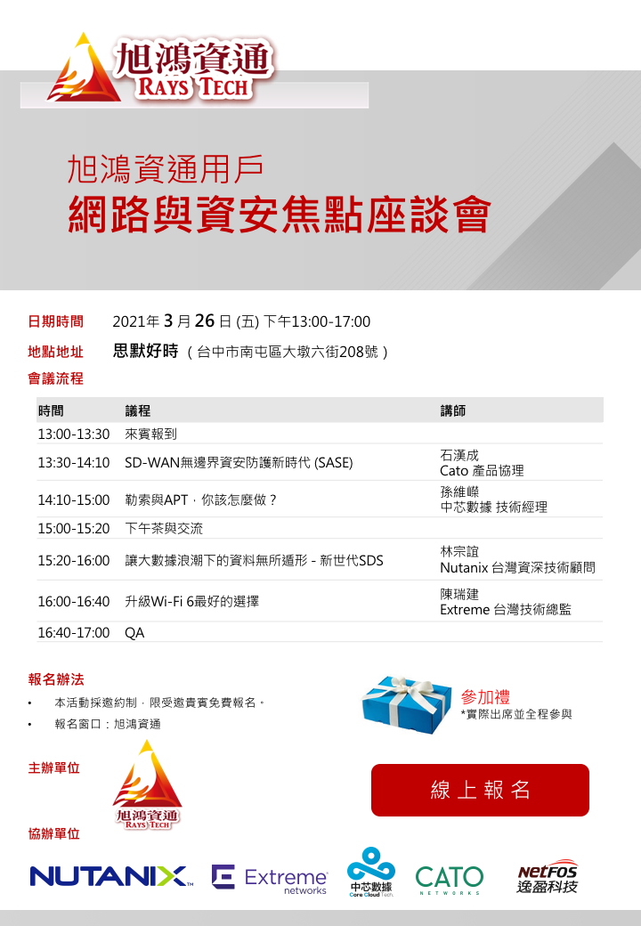 - 參展原廠 Nutanix, Extreme, Cato, CoreCloud