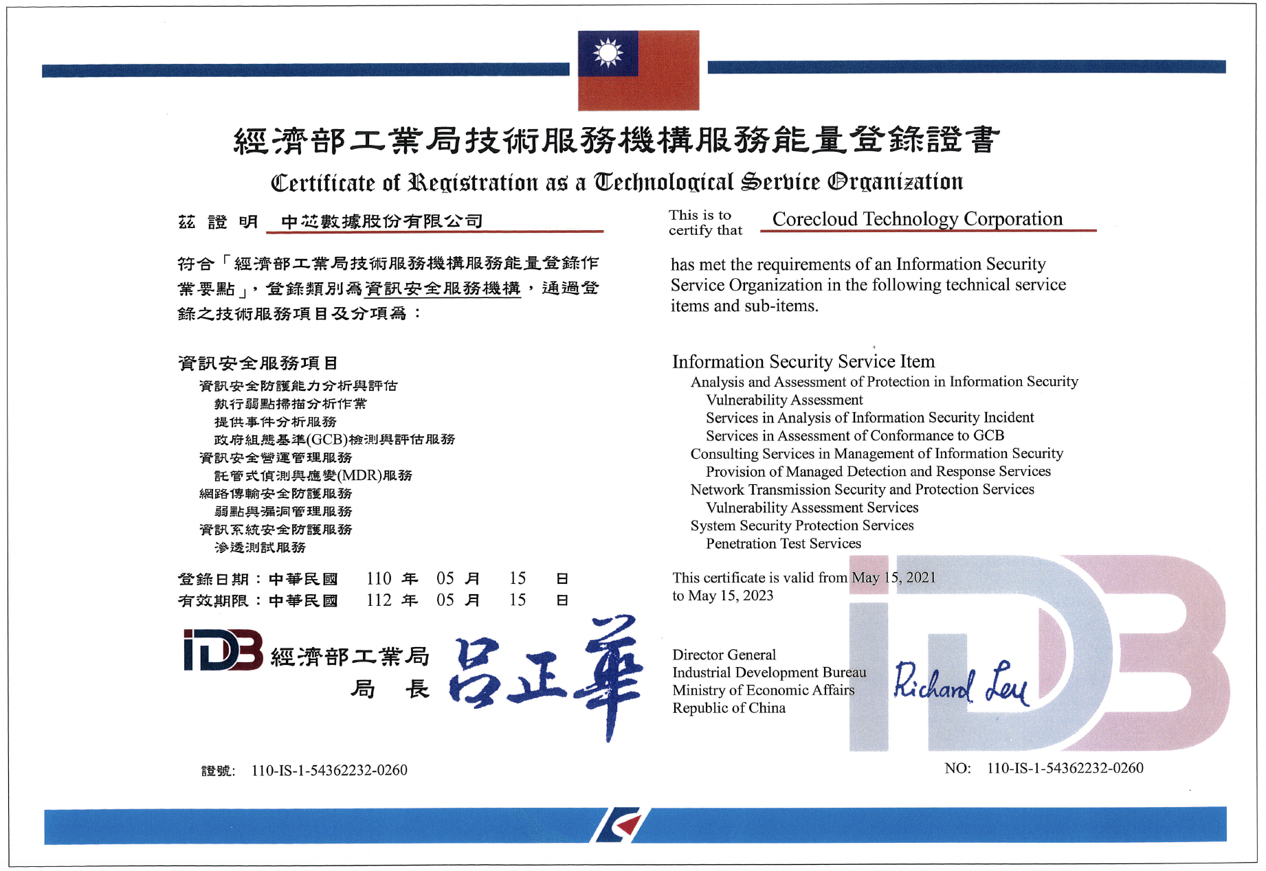 中芯數據獲認證核准「經濟部工業局技術服務機構的服務能量登錄證書」