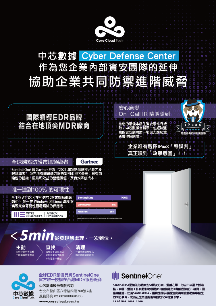 中芯數據股份有限公司為正式通過國際標準資安認證機構 IOS27001 認證,可提供企業符合國際標準的資訊安全管理規範,讓客戶能夠專注在自身業務與推廣上。中芯數據作為企業內部資安團隊的延伸,協助企業共同防禦進階威脅。如需瞭解更多資訊,請造訪 www.corecloud.com.tw