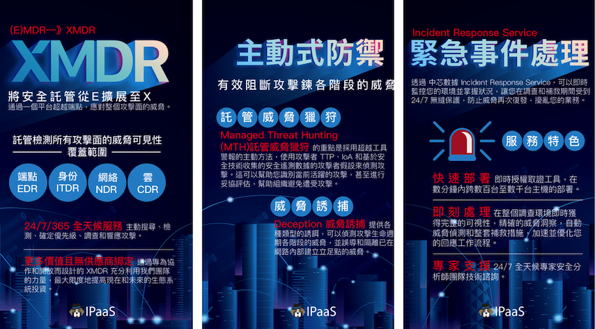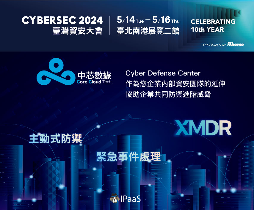 中芯數據很榮幸共同參與「CYBERSEC 2024 臺灣資安大會」,我們於2024年 5 月 14 日至 16 日於臺北南港展覽二館展覽期間,中芯數據IPaaS意圖威脅即時鑑識服務強力推出三大服務趨勢方案,包含『XMDR 無供應商綁定服務』、『託管威脅狩獵服務』、『緊急事件即時處理服務』,為您全面資安整合上助一臂之力!