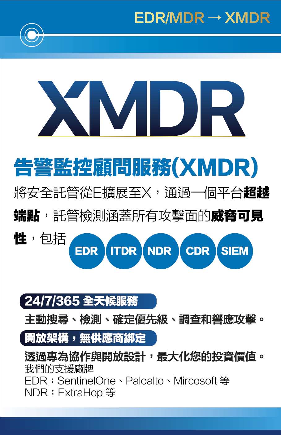 - XMDR 整合式資安防護 – EDR + NDR + XMDR為企業及時應對各種威脅。點擊下載完整資料