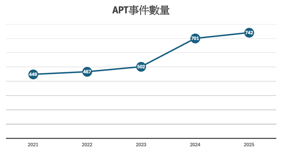 有組織、有計劃性的APT攻擊在台灣不斷發生,於2025年中芯數據MDR團隊就抓獲742筆的APT事件。這些事件都有一個特性,就是攻擊者能繞過縱深防禦的資安架構,一路從最外層防火牆、WAF到防毒軟體等各種資安防護設備。在資安人員難以發現或確認的情況下,竊取單位的機敏資料、加密設備,進而發展成新聞上看到造成重大損害的事件。