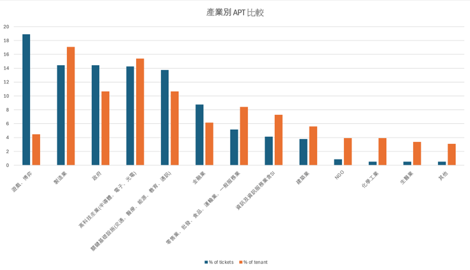 - 藍色 > 橘色,當比例相差越大意味相對少的客戶數卻遭遇大量APT事件,可解釋為相對較易遭攻破或是駭客較有興趣攻擊的產業。