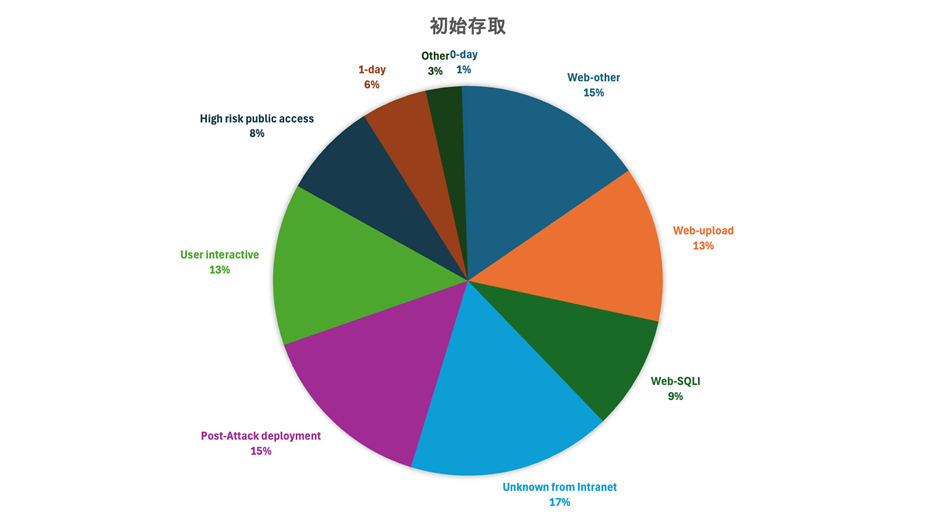 - Web: 從對外網頁服務作為初始進入點之比例最高,包含常見的上傳漏洞13%、SQL Injection 9%及其他各式網頁漏洞15%,共約4成。